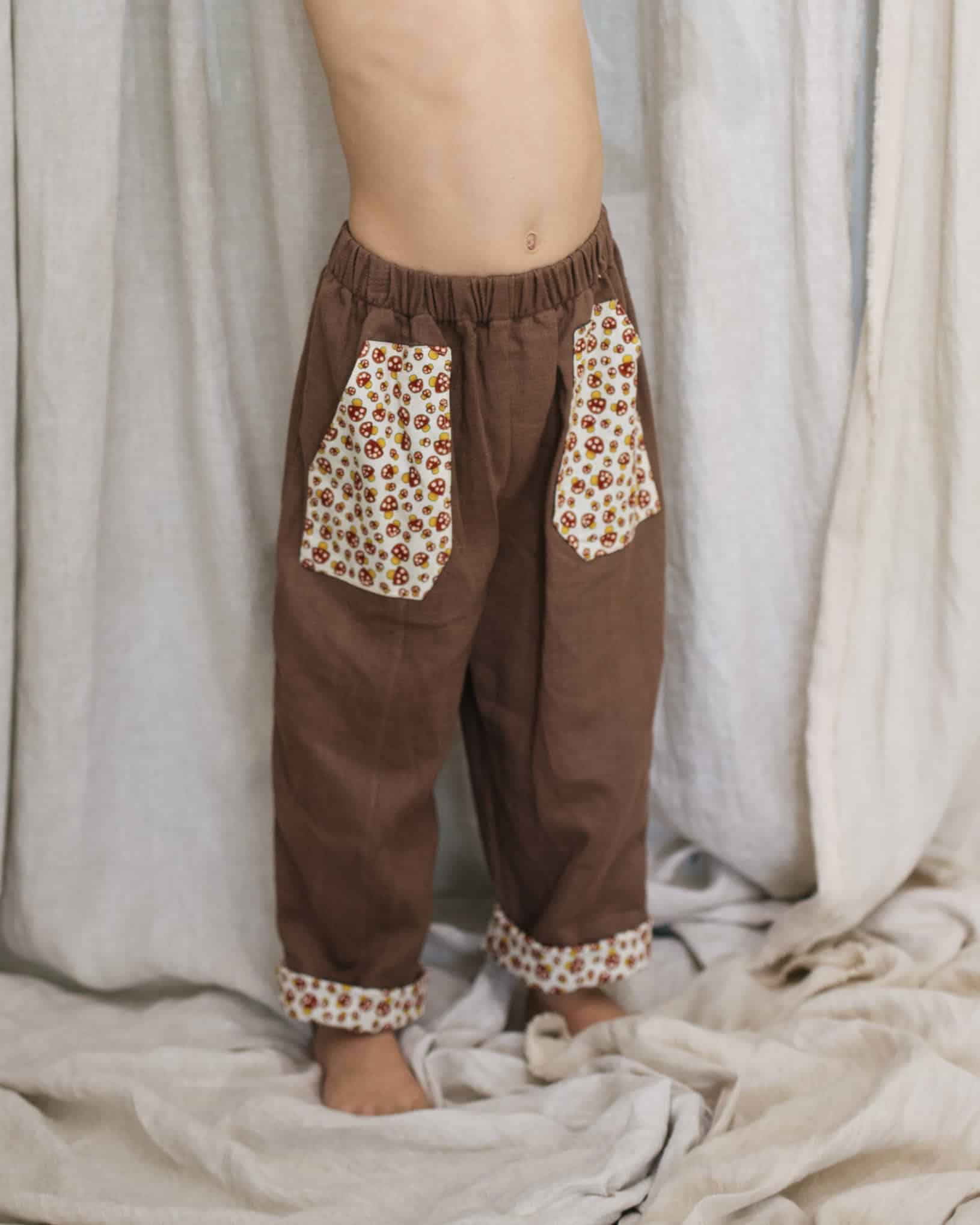 Little legs, big adventures - wrapped in vintage charm. These one-of-a-kind pants are crafted from vintage and secondhand fabrics, designed with playful details and everyday comfort in mind. Featuring two front pockets, one back pocket, these pants are ready for adventure. The fold-up cuffs match the pocket fabric, adding a fun twist and allowing the length to adjust as your child grows. An elastic waistband ensures an easy, relaxed fit all day long.