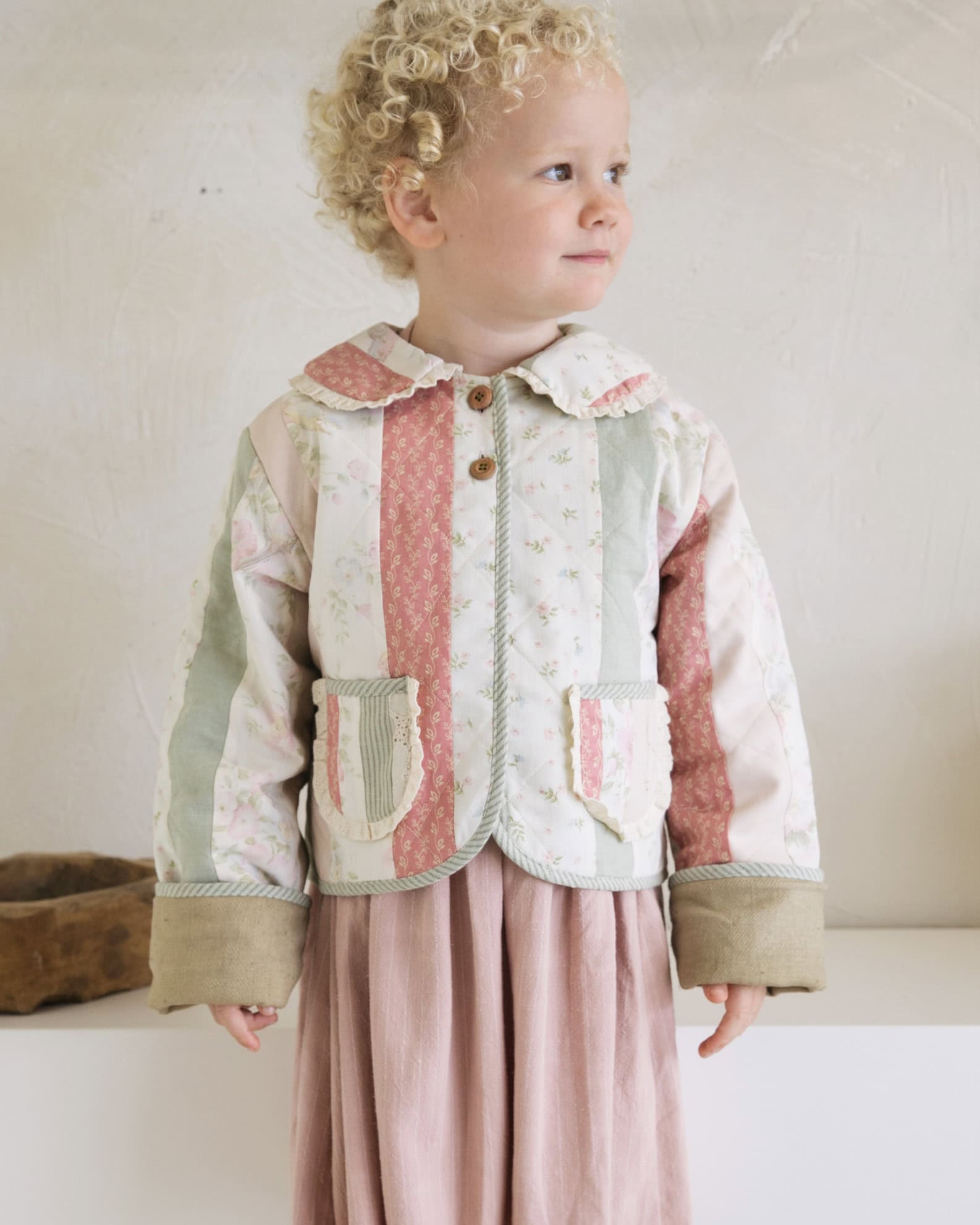 A cosy classic made to be passed down. This quilted jacket is thoughtfully made from vintage and second-hand fabrics, giving old textiles new life. It features a relaxed fit, two handy front pockets trimmed with lace, and a patchwork collar with delicate lace detail. The long sleeves are designed to be folded up for growing arms, perfect for growing little ones.