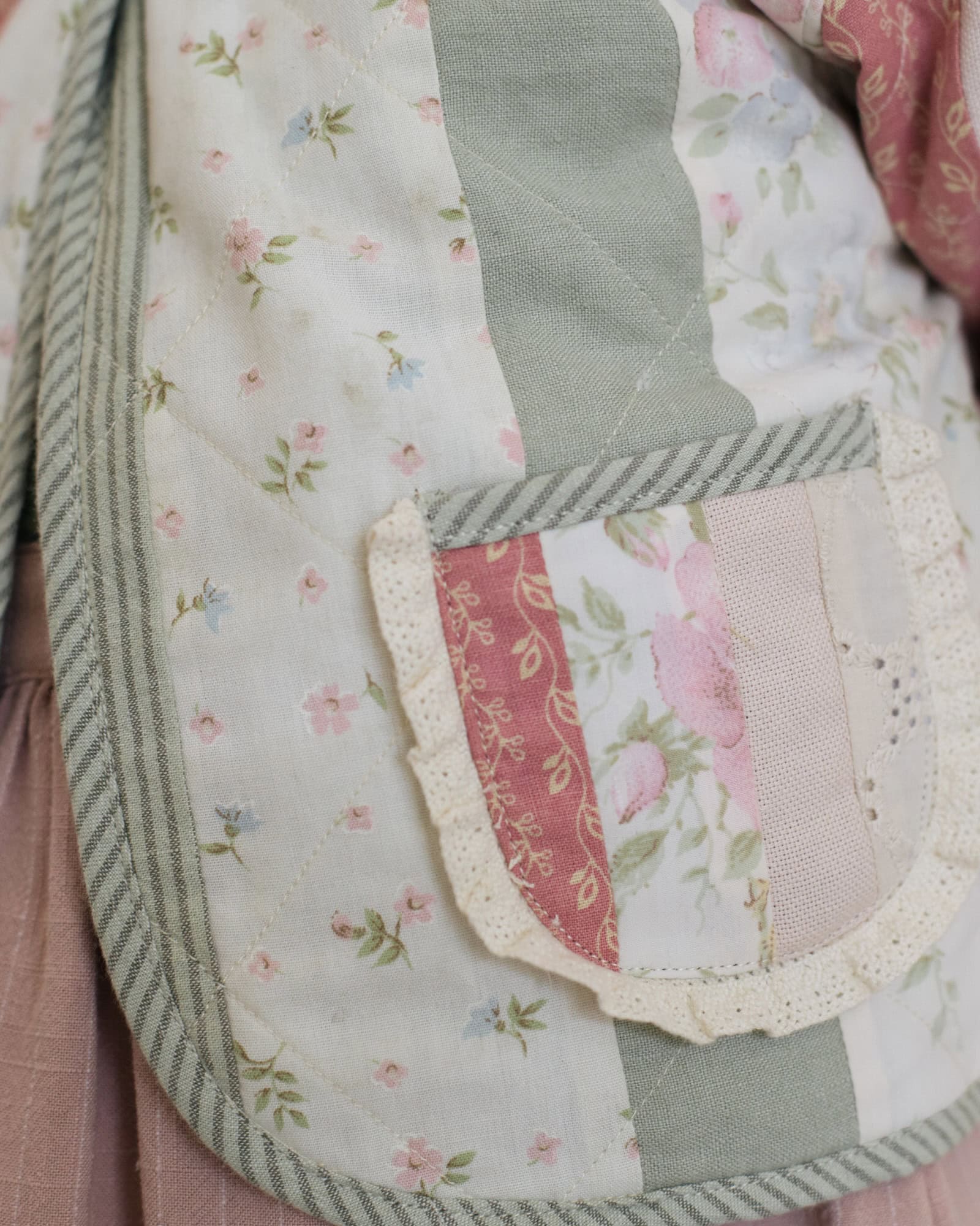 Patchwork collar + lace-trimmed pockets